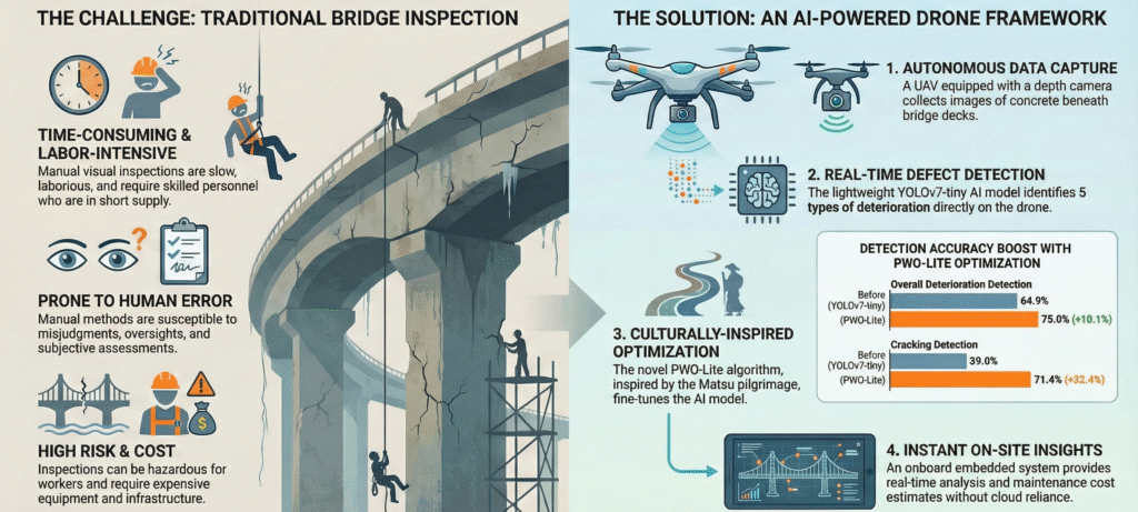 This isn’t science fiction. It’s the breakthrough presented in the research by Chou and Liu, who developed an Optimized Lightweight Edge Computing Platform for UAV-Assisted Detection of Concrete Deterioration. In simple terms, they’ve created a “smart bridge doctor” that combines off-the-shelf drones with a powerful yet efficient AI system, inspired by an unexpected source: a traditional Taiwanese religious pilgrimage.