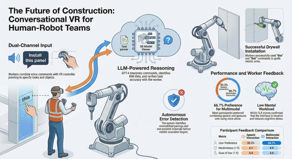 Imagine you’re on a construction site, surrounded by noise, dust, and a maze of materials. You need a robotic arm to install a drywall panel, but shouting over the din is hopeless, and typing commands is too slow. What if you could just point at the panel, say “put that here,” and have the robot understand you perfectly? That’s no longer science fiction, it’s happening now, thanks to groundbreaking research that merges Virtual Reality (VR), AI, and robotics.