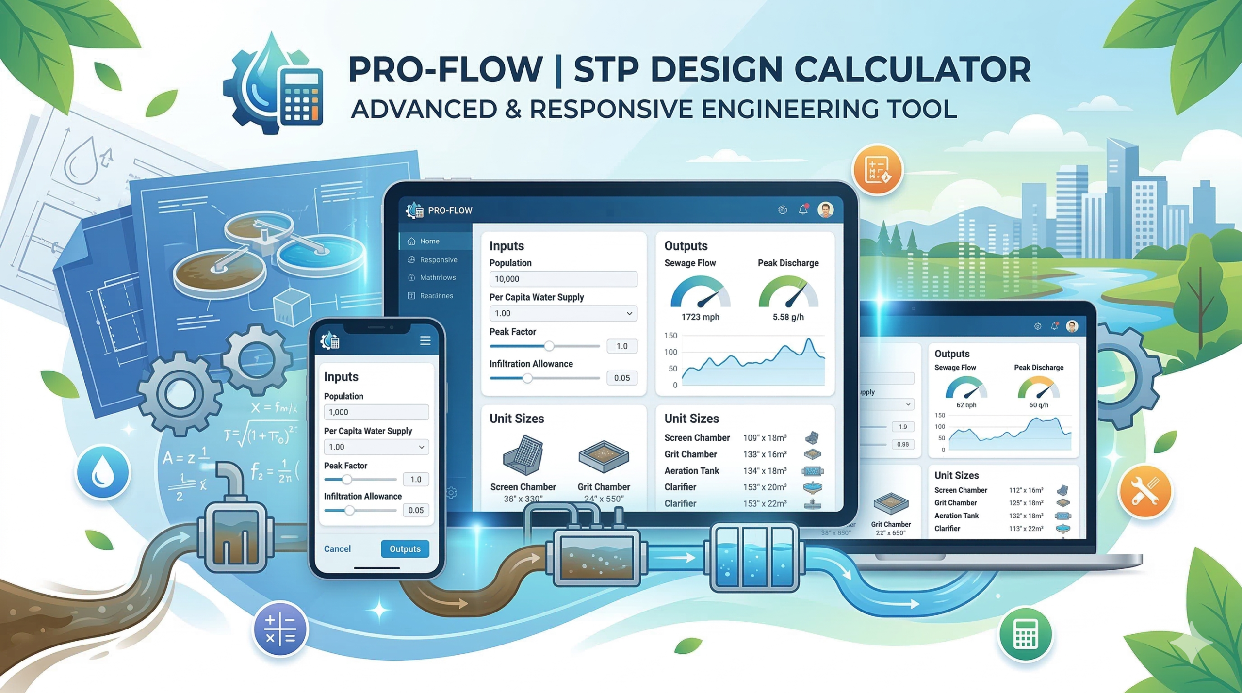 - Population & Flow Dynamics: It translates per capita water supply into total daily flow using the standard 80% return factor.
